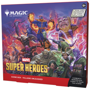 Immortalize epic conflicts with a Magic: The Gathering | Marvel Super Heroes Scene Box. Power up your deck or collection with six traditional foil borderless scene cards. While each scene card is a playable Magic card (including game text), this box also contains six art-only cards that allow you to appreciate the scene in all its glory and display it on the included easel! Each Scene Box comes with three Play Boosters; the best way to discover what Magic has to offer, they're perfect for building decks, playing games with friends, and are tons of fun to open.